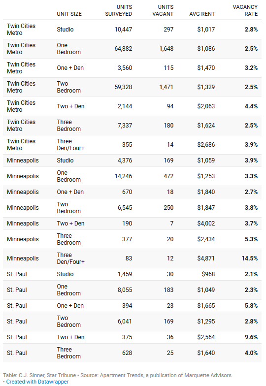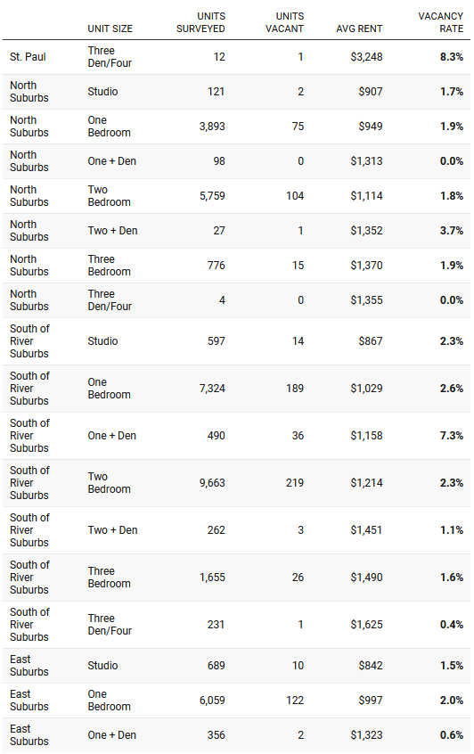 Here are the average rents and vacancy rates for various rental housing floor plan options in the Twin Cities and surrounding areas.